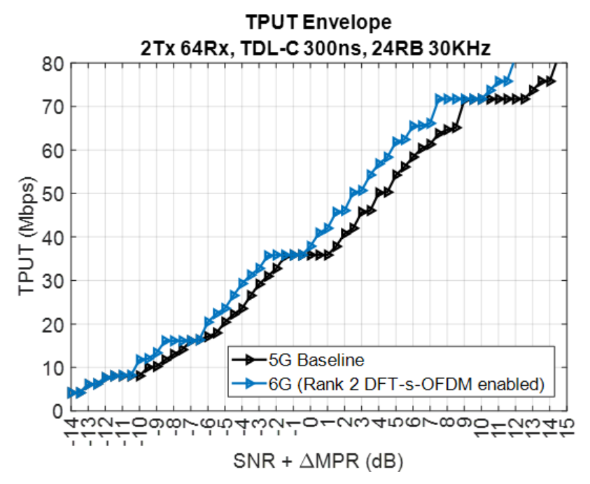 Figure below presents the throughput gain achieved by switching a rank-2 transmission from CP-OFDM to DFT-S-OFDM for a PC2 UE powered by 2 PC3 PAs. Note that the differences in maximum transmit powers as determined by the MPR values are reflected in the throughput curves.