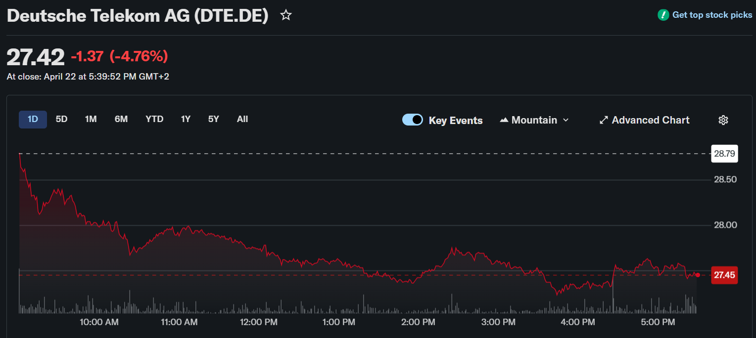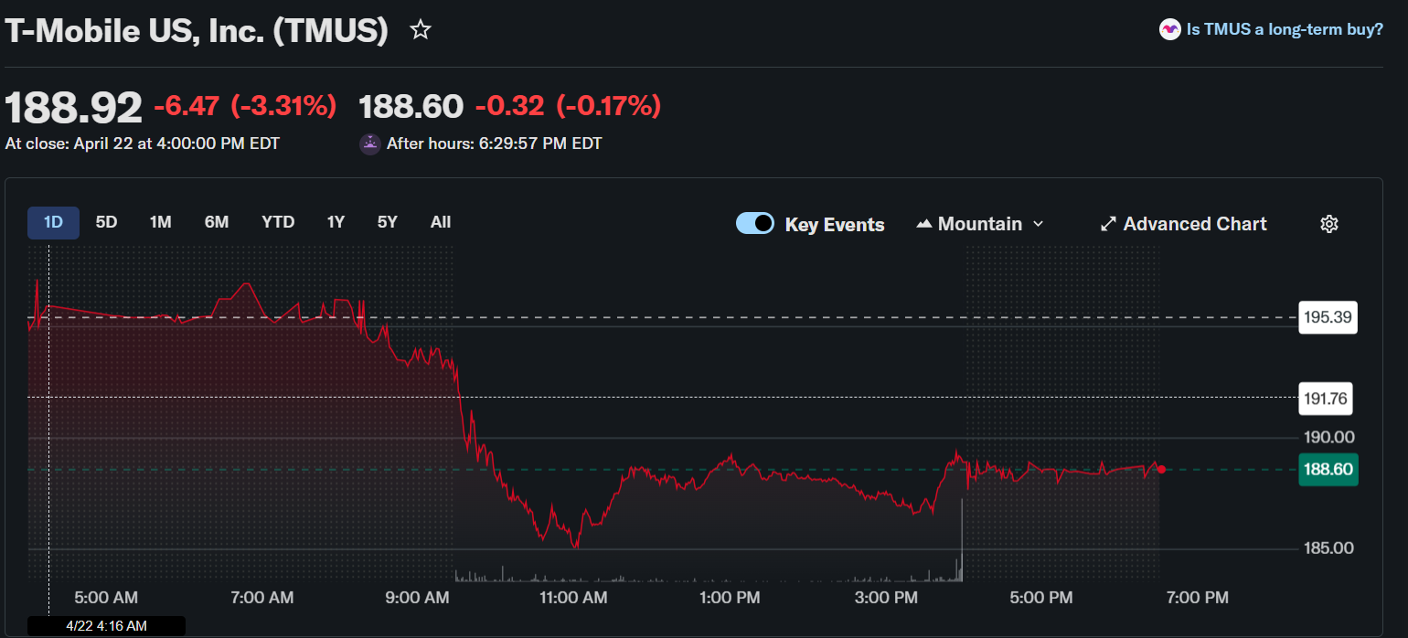 T-Mobile US shares declined approximately 3.5 per cent in New York by mid-afternoon — a classic deal-premium compression in the acquirer alongside uncertainty in the target.