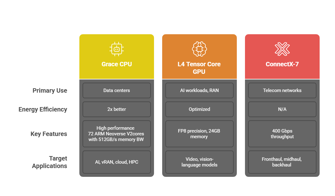 - RAN and AI-centric: Designed for more demanding scenarios, this setup incorporates an additional L4 GPU for AI or visual processing, while simultaneously supporting advanced RAN workloads using the primary Grace C1 CPU and L4 GPU.