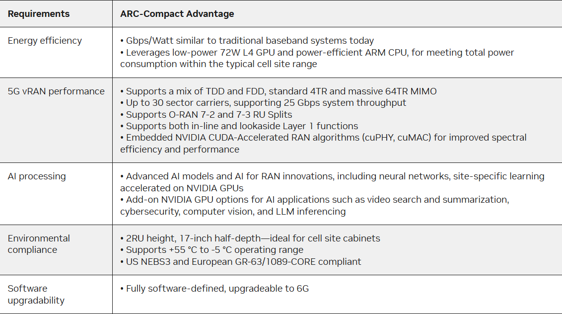 According to internal NVIDIA benchmarks, ARC-Compact meets the critical performance, power, and scalability requirements for distributed AI-RAN environments, as detailed in Table 1.